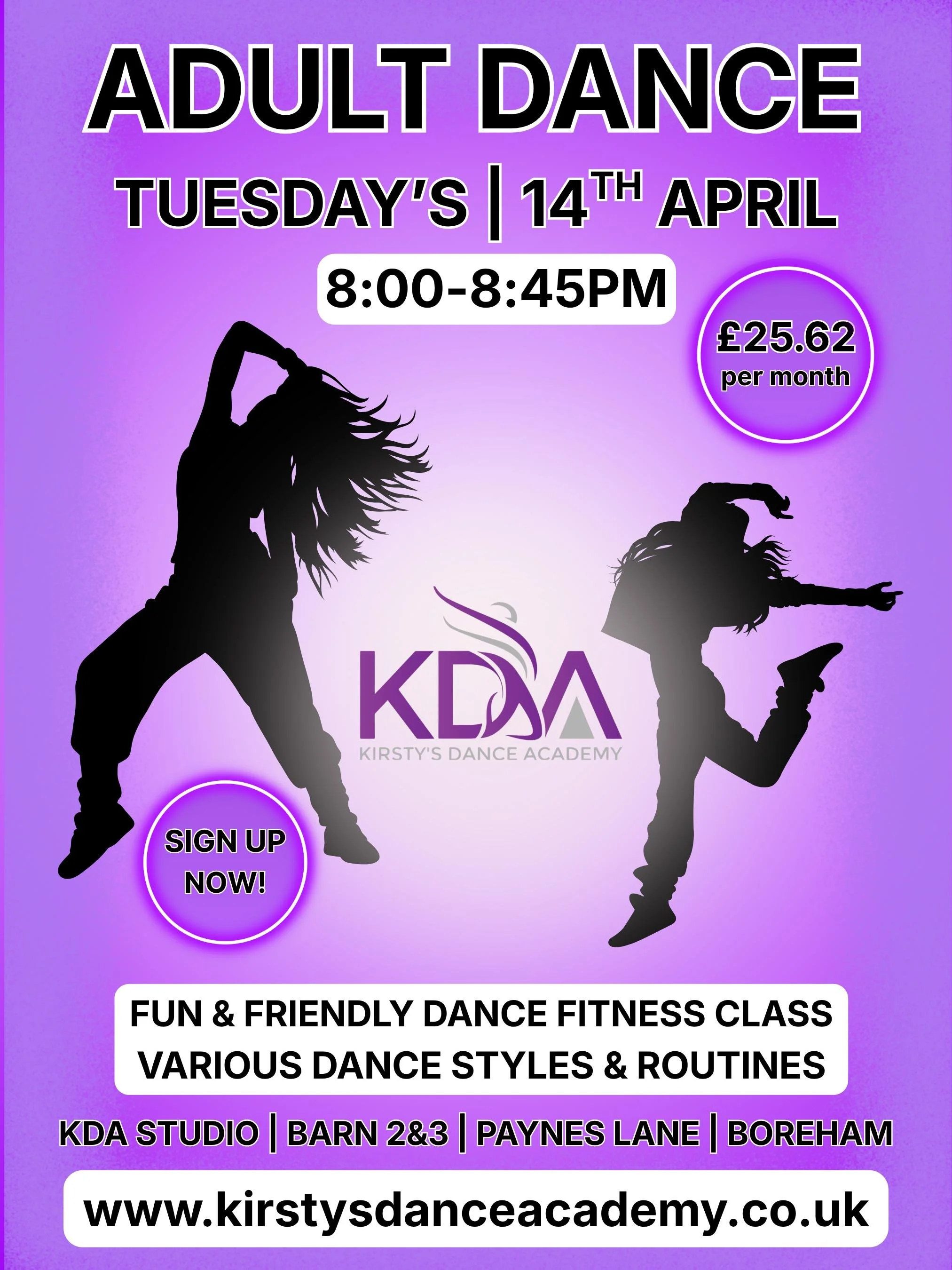 Looking for a fun way to get fit and try something new? Join our brand new adult dance class - a high energy session where you’ll learn exciting routines, boost your fitness and have a great time in a relaxed, friendly environment, No experience needed.